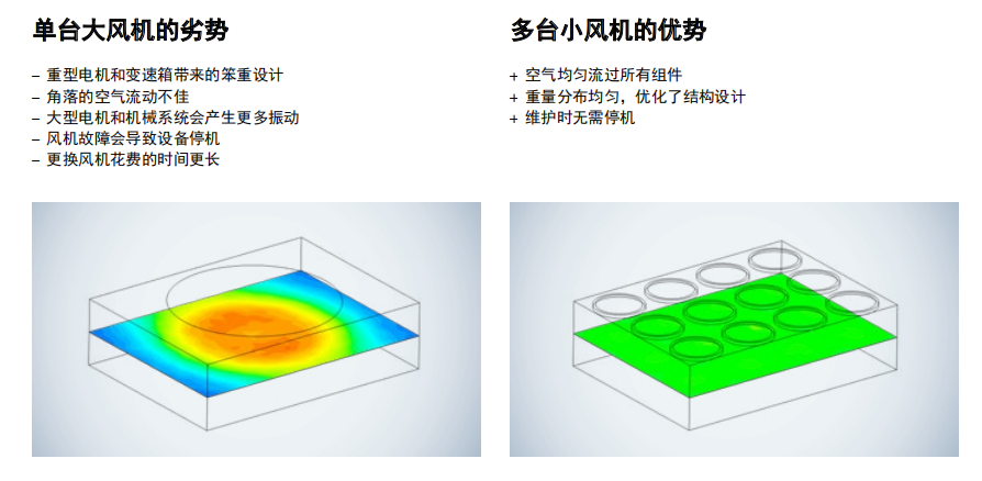 風墻技術(shù),采用多個風機并聯(lián)運行的模式,可大幅提高運行的可靠性并確保有恒定的風量流過冷卻塔,可提供超高空氣流量。如果其中一臺設(shè)備需要維修,其他風機會提高風量,以彌補損失的空氣流量,使冷卻塔達到相同制冷量且不間斷運行。此外,即插即用的方式使風墻解決方案的安裝更加便利。通過MODBUS RTU,可直接監(jiān)控風墻的運行狀態(tài),無需定期維護,僅根據(jù)設(shè)備狀態(tài)按需進行便可,用戶可更輕松地規(guī)劃服務(wù)方案。