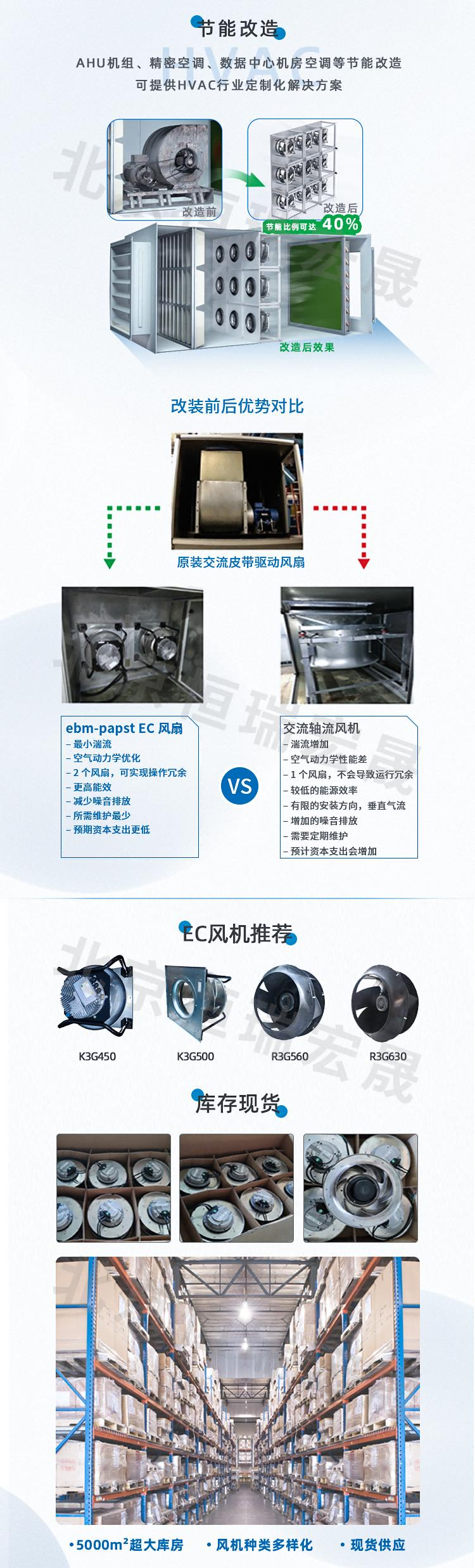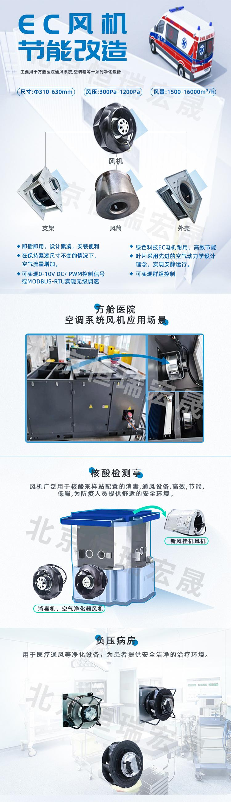 北京恒瑞宏晟專業供應用于方艙醫院通風系統、核酸檢測亭、負壓病房、消毒柜、除濕機等設備高性能AC/EC風機。同時具備公共建筑、數據機房、商用建筑等通風節能改造能力及方案,是您節能改造的最優選擇,歡迎廣大客戶朋友考察推薦!