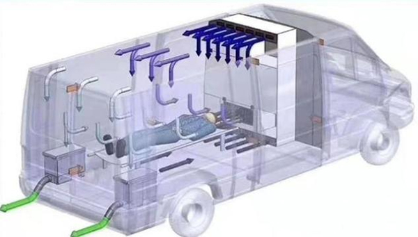 救護車啟動了負壓裝置后,系統將對擔架上患者呼出的空氣進行強力抽吸,最終經過濾設備消毒后排出車外,成為無污染空氣。由于車內醫療艙形成了比外部大氣壓低10-30Pa的負壓,病人呼出的空氣不會從車輛門窗縫隙排出車外,能夠有效防止病毒感染沿途環境。而進入車內的新風也會進行過濾,保證病人不會因外部環境造成感染。