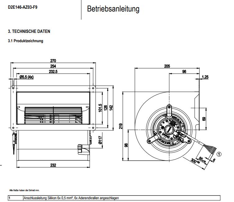 W2E250-HP06-01風量:1695m³/h 電壓:230v 電流:0.55A 功率:125W 轉速:2320r/min