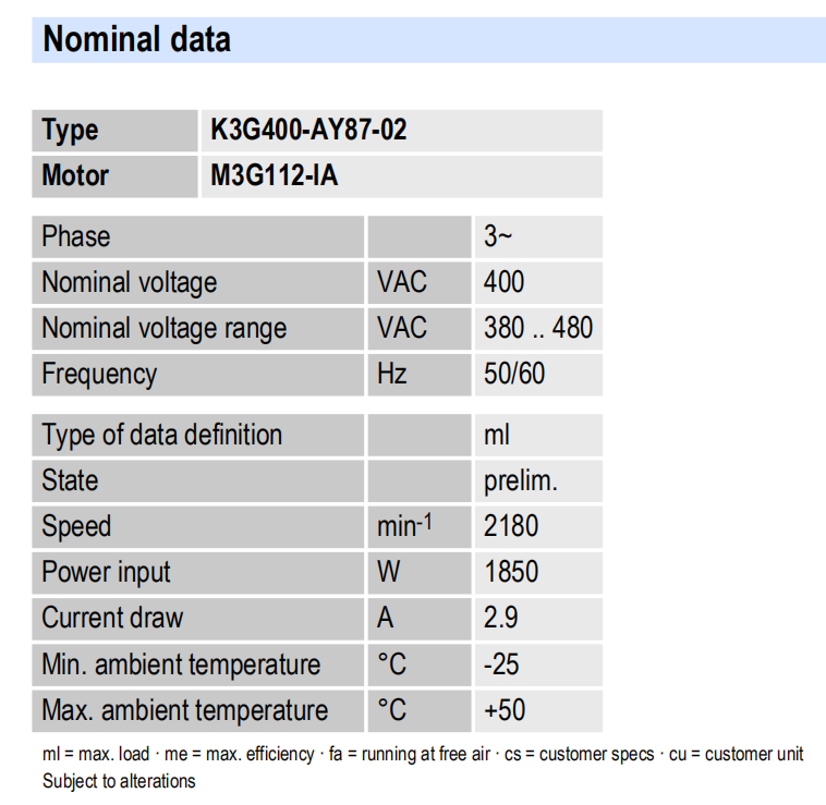 K3G450-RK56-01電壓:380-480V電流:1.50A功率:950W 轉速:1550r/min 重量:10.6KG