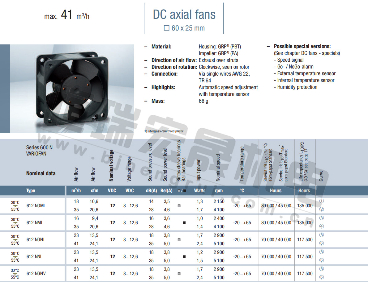 612NN風量:42m³/h 電壓:12v 噪音:35Db 功率:1.5W 轉速:5100r/min