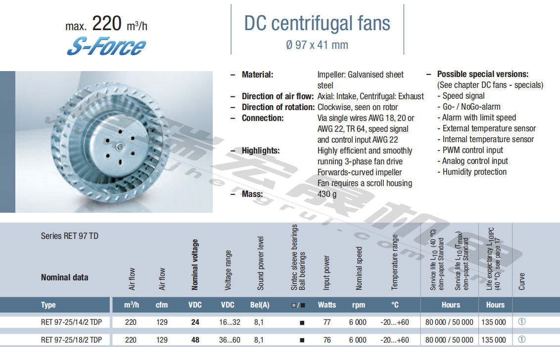 RET97-25/14/2TDP風量:220m³/h 電壓:24v 電流:8.1A 功率:77W 轉(zhuǎn)速:6000r/min