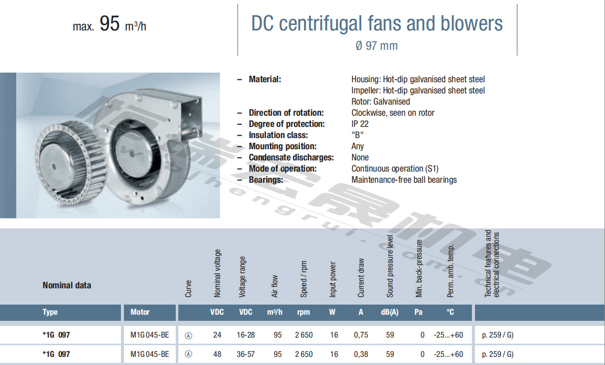 G1G085-AB05-01風量:95m³/h 電壓:24v 電流:0.64A 功率:14W 轉速:2850r/min