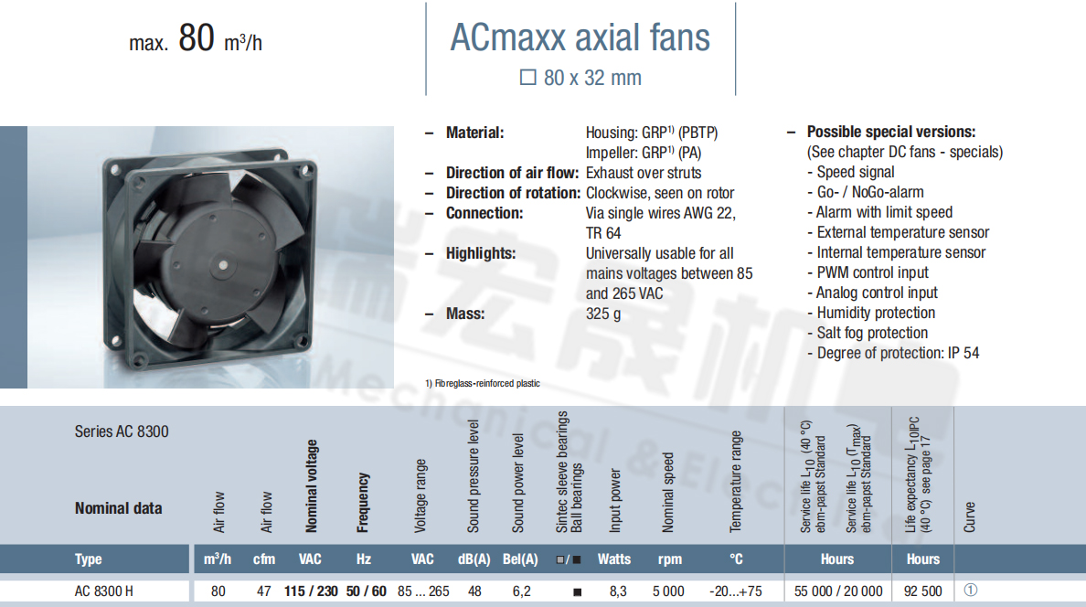 Aci4420H風量:160m³/h 電壓:230v 電流:5.1A 功率:3.2W 轉速:3000r/min
