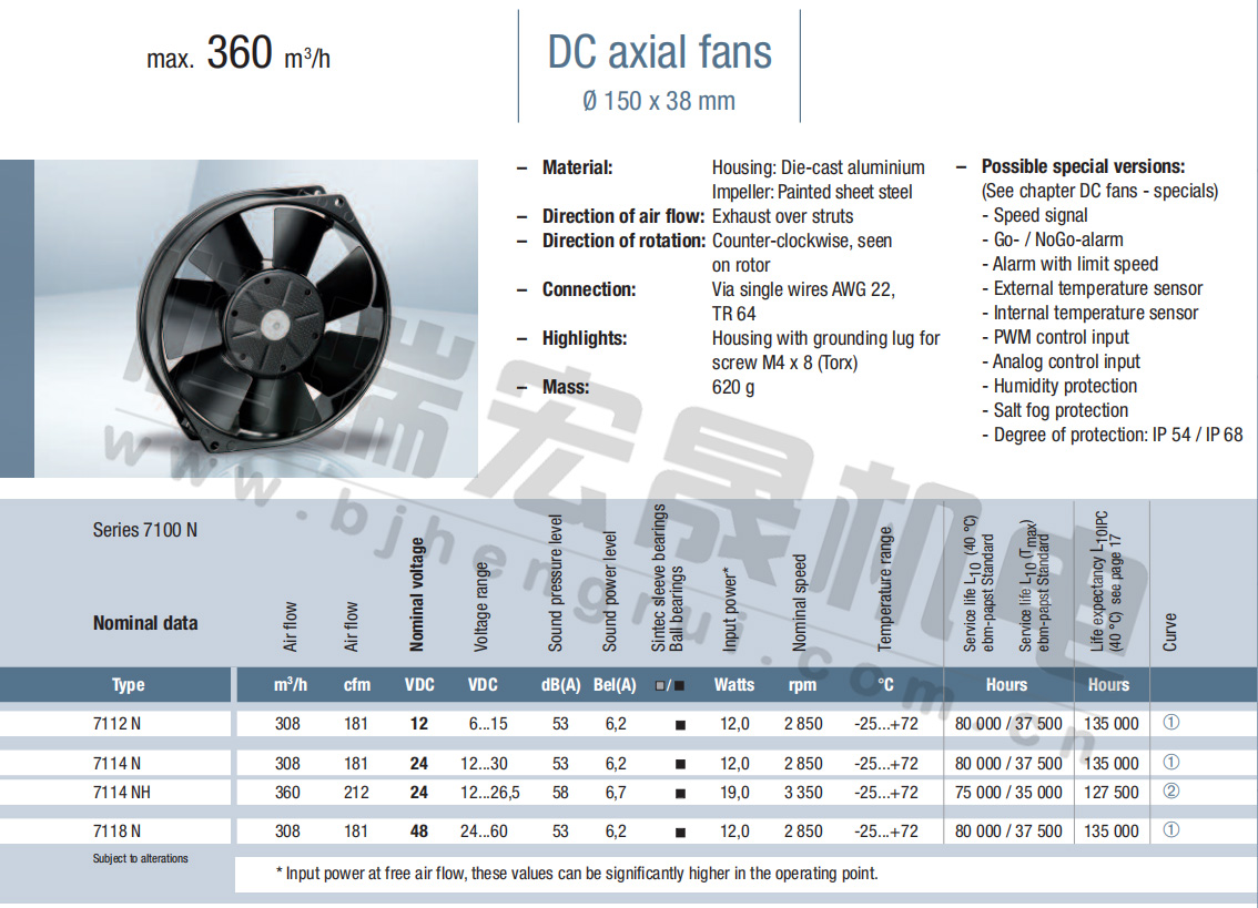 7114NH風量:360m³/h 電壓:24v 噪音:58Db 功率:19W 轉速:3350r/min