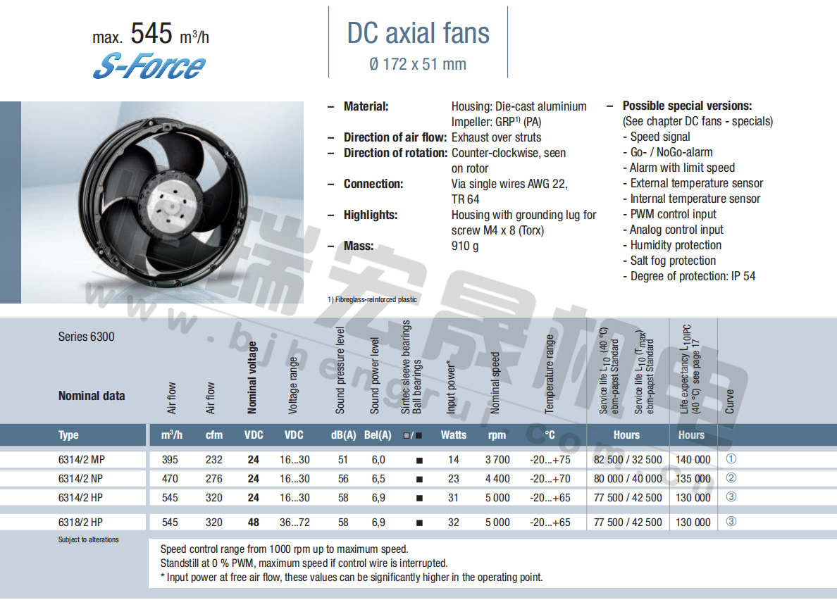 6314/2HP風量:545m³/h 電壓:24v 噪音:58Db 功率:31W 轉速:5000r/min