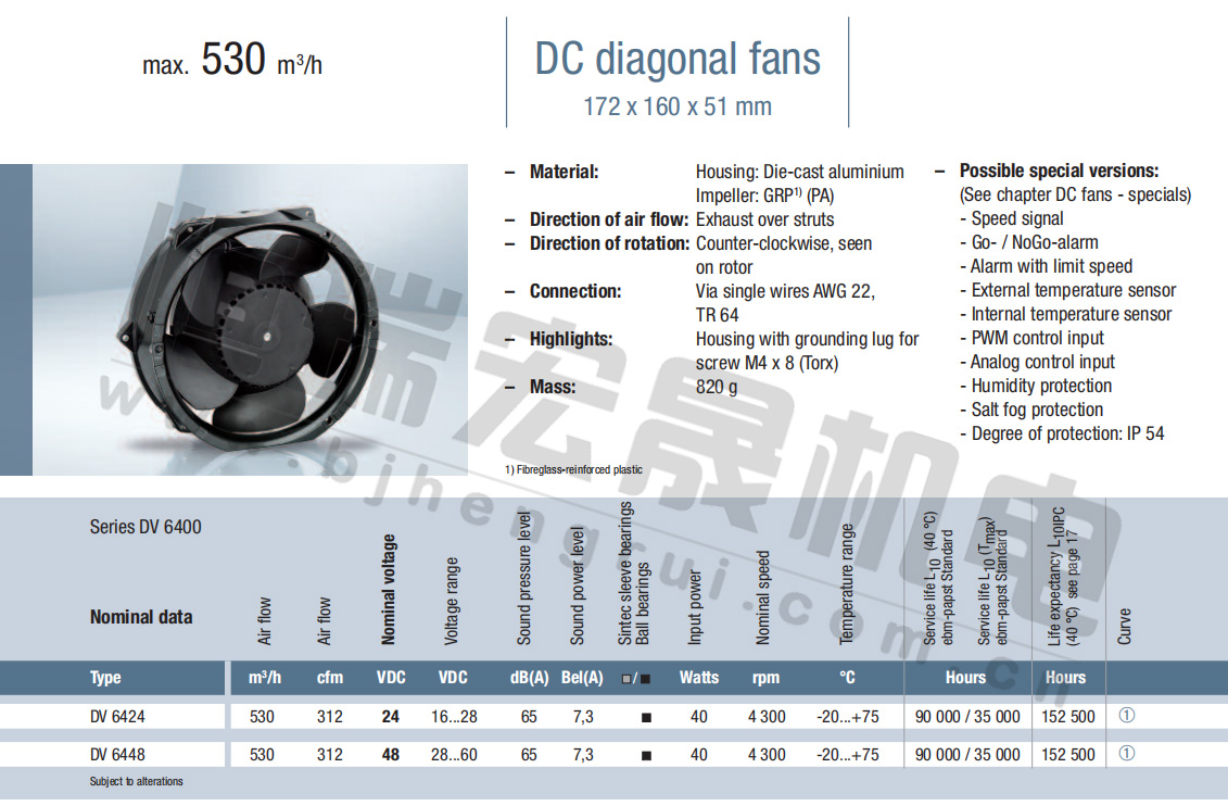 DV 6424 風量:530m³/h 電壓:24v 噪音:65Db 功率:40W 轉速:4300r/min