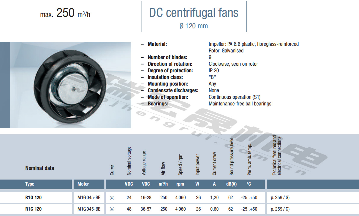 G1G133-DE19-02風量:225m³/h 電壓:24v 電流:2.2A 功率:40W 轉速:2000r/min