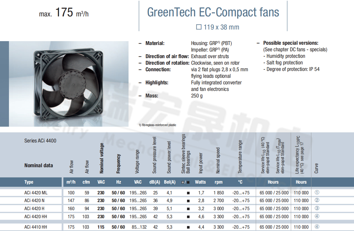 Aci4420HH風量:175m³/h 電壓:230v 電流:5.3A 功率:4.6W 轉速:3300r/min