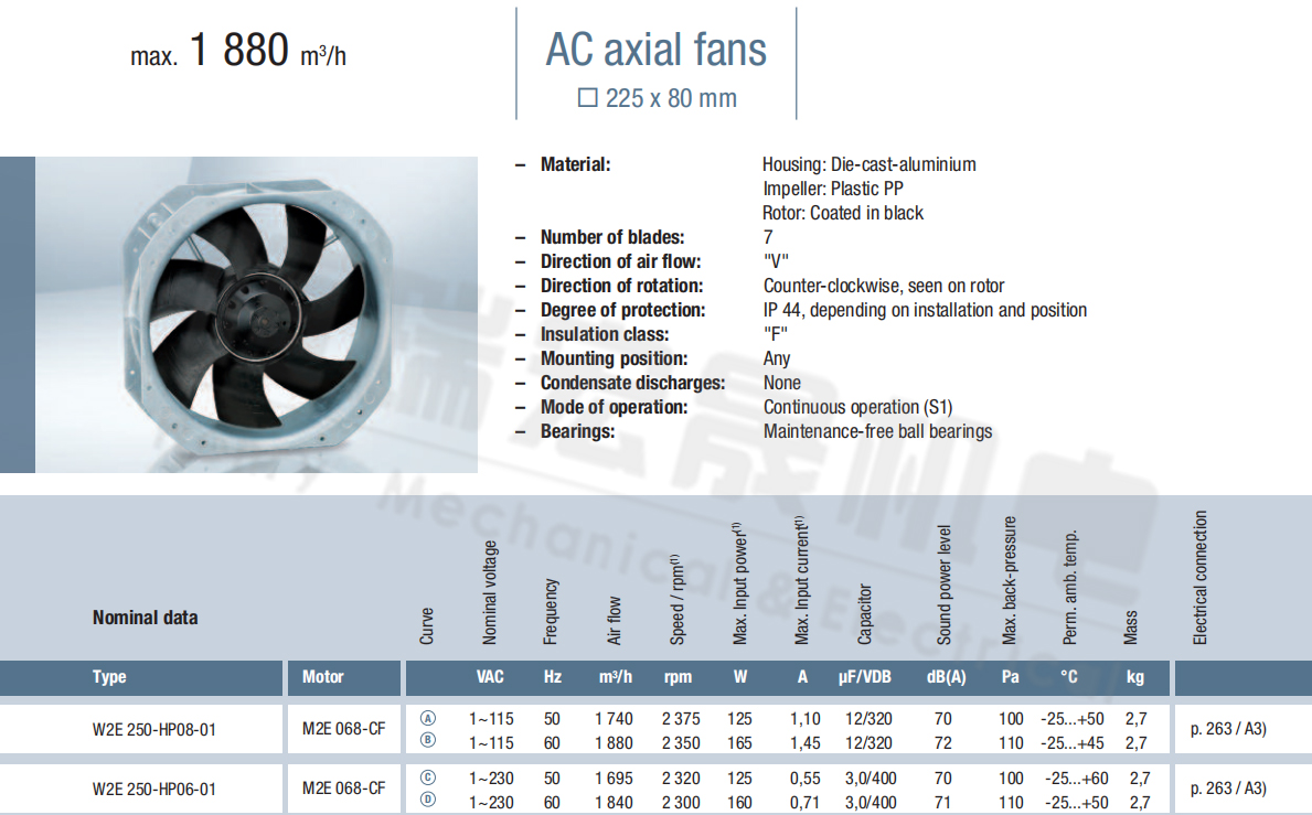 W2E250-HP06-01風(fēng)量:1695m³/h 電壓:230v 電流:0.55A 功率:125W 轉(zhuǎn)速:2320r/min